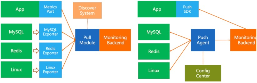 | 部署方式 | 1. 应用暴露端口,接入服务发现,原生支持Pull协议; 2. 其他系统例如主机、MySQL、NGINX等中间件依赖适配器(也成为Exporter)去抓取指标再提供Pull端口  |