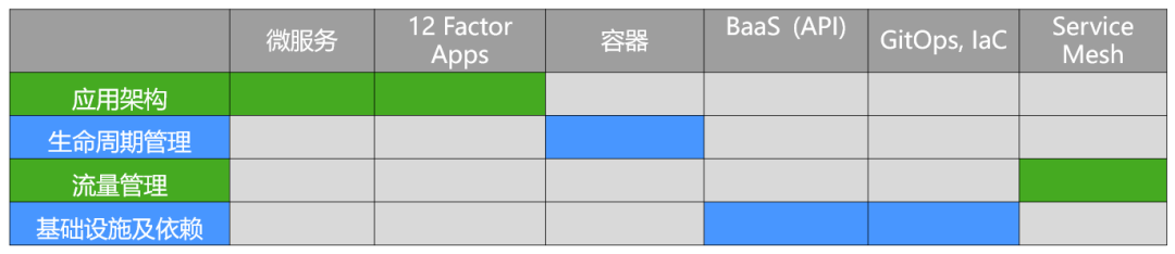 BaaS——Backend as a Service,能够尽量使用现有的服务来构建应用程序。Service Mesh的本质是管理流量,今天的应用程序都在接收流量,提供服务时流量又需要出去,在这个过程中如何管理服务发现、流量路由规则等都需要Service Mesh技术。最后需要重点介绍的就是GitOps和IaC(Infrastructure as Code),这些技术如今在行业里面得到了越来越多的关注,尽管还没有事实上的标准,但是很多云计算公司正在不断努力。其含义是说今天在使用基础设施的时候,可以用代码去声明这些基础设施的需求。总而言之,上述这些内容都是围绕应用架构、生命周期管理、流量管理,以及基础设施及依赖这四个维度的。