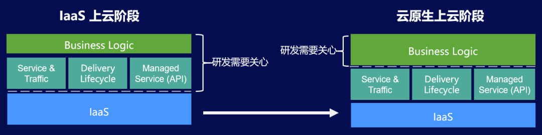 进一步细化就会发现,在原来的IaaS上云阶段,除了需要关心业务逻辑之外,还需要关心业务应用的生命周期管理、流量管理,还需要自己进行搭建和配置中间件,比如在云环境中搭建Redis、kafka等,也就是说花费了大量时间在应用依赖管理的事情上,无法让云平台进行管理。今天,在PaaS上云或者云原生上云的阶段,想要做到的就是尽量使用云平台提供的能力,将更多的精力集中在业务本身,而将业务无关的通用技术能力都交给云来管理。