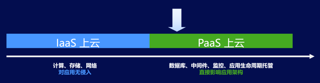 IaaS阶段和PaaS阶段其实存在很大的差别。在IaaS阶段,对于应用研发来说,所关心的往往就是基础设施和资源,通俗来讲就是虚拟机或者容器等,这些对应用架构几乎没有任何侵入。但是在PaaS上云阶段,当你使用云产品,比如云Redis、云RDS、云OSS、云RabbitMQ等的时候,都会对于应用架构产生比较强的侵入。那么,这样的侵入会对应用架构产生什么样的影响,是所有研发架构师所需要思考的一个问题。