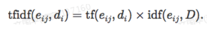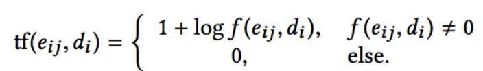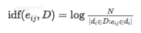 这二者边的建立,可以是 impression, click and/or conversion,一般情况下 impression 的数量远远大于 click,远远大于 conversion,但是这三者带来的价值却正好是相反的,及 value(impression)<value(click)<value(conversion)。基于这个问题,我们借鉴 tf-idf 的思想,我们假设节点之间的边是一个 document,三种不同种类的节点是三个独特的 term。假定 f(eij,di) 是 term eij 在 documentdi 出现的频次,我们使用以下 log 变换去定义 term 的频率 (tf):