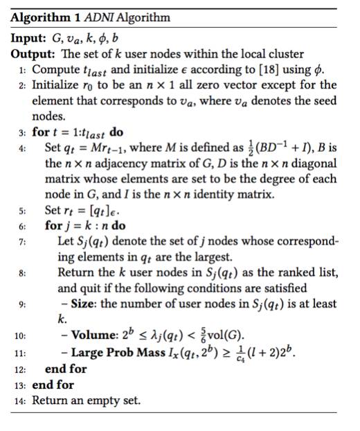 [1] D. Spielman and S. Teng. A local clustering algorithm for massive graphs and its application to nearly linear time graph partitioning. SIAM Journal of Computation, 42:1–26, 2013.