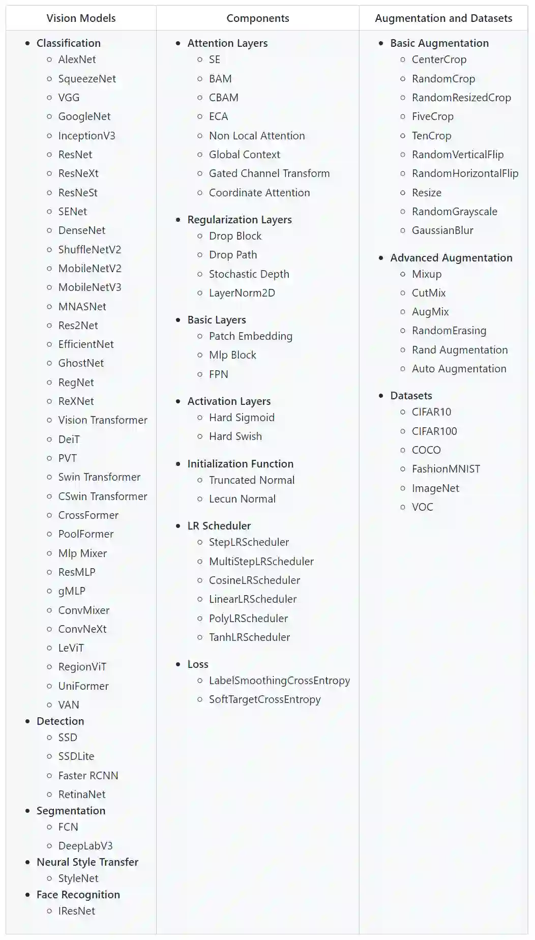 不妨先到 OneFlow 视觉模型库 flowvision 看一看:https://github.com/Oneflow-Inc/vision ,这个模型库已经支持计算机视觉领域图像分类、分割和检测等方向的经典 SOTA 模型 (见下表),这些模型都可以通过 import torch as flow 或 import oneflow as torch 实现自由切换。