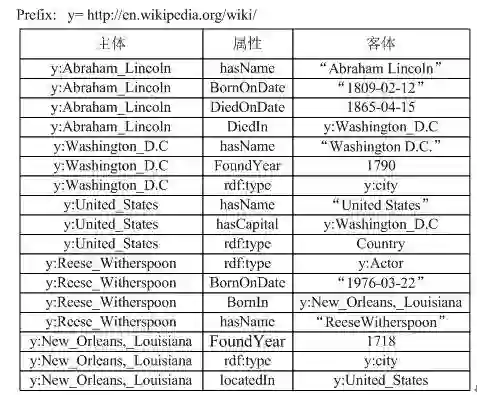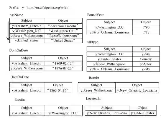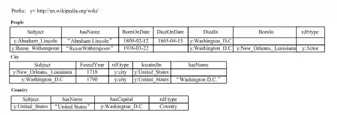 下图1展示了一个人物类百科的 RDF 三元组的知识图谱数据集。例如 y:Abraham_Lincoln 表示一个实体 URI(其中y表示前缀http://en.wikipedia.org/wiki/),其有 3 三个属性(hasName,BornOndate,DiedOnDate)和一个关系(DiedIn)。