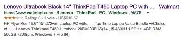 下面介绍Google另外一个利用知识图谱的项目叫“Google Rich Snippets”(Google富摘要)。搜索引擎在搜索结果的页面中会为每一篇搜索结果提供一个目标网页的摘要,以便用户判断是否是自己想搜索的页面。通常网页的摘要是采用“抽取式”方式生成的,即从网页的页面文本中找到和搜索关键词相关的并且比较重要的句子来构成页面的摘要返回给用户。但是Google的富摘要产品中,会抽取在用户HTML页面中以结构化形式存在的知识图谱数据,例如描述实体的属性的数据。目前这方面的标准有包括RDFa, Microdata和Schema.org等结构化数据标签。假设用户想在搜索“Thinkpad T450”产品,在Google返回的Walmart(沃尔玛)线上商店的页面摘要(如图7所示)中,摘要中包含了这个产品的打分(Rating 3星),评论数目(Vote 1份评论)和商品的价格(616.67 美金)。实际上这些重要的数据,用户已经通过Schema.org等结构化的语义标签在HTML中标示出来了,搜索引擎可以通过解析器(Parser)解析出这些结构化数据,利用这些结构化知识图谱数据来产生摘要。我们在图6中展示了利用Google的结构化测试工具,可以从上述沃尔玛产品页面的HTML中抽取上面提到的商品的价格和商标等属性信息。