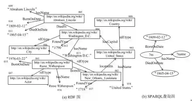 我们也可以将 RDF 和 SPARQL 分别表示成图的形式。例如在RDF中,主体和客体可以分别表示成RDF图中的节点,一条称述(即RDF三元组)可以表示成一条边,其中谓词是边的标签。SPARQL语句同样可以表示成一个查询图。 图3显示了上例所对应的RDF图和SPARQL查询图结构。回答SPARQL查询本质上就是在RDF图中找到SPARQL查询图的子图匹配的位置,这就是基于图数据库的回答SPARQL查询的理论基础。在图3例子中,由节点005,009,010和011所推导的子图就是查询图的一个匹配,根据此匹配很容易知道SPARQL的查询结果是“Abraham Lincoln”。