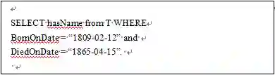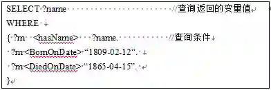 面向 RDF 数据集,W3C 提出了一种结构化查询语言 SPARQL;它类似于面向关系数据库的查询语言 SQL。和 SQL 一样,SPARQL 也是一种描述性的结构化查询语言,即用户只需要按照SPARQL定义的语法规则去描述其想查询的信息即可,不需要明确指定如何进行查询的计算机的实现步骤。2008 年 1 月, SPARQL 成为 W3C 的正式标准。SPARQL 中的 WHERE 子句定义了查询条件,其也是由三元组来表示。我们不过多的介绍语法细节,有兴趣的读者可以参考 [1]。下面的例子解释了 SPARQL 语言。假设我们需要在上面的 RDF 数据中查询“在 1809 年 2 月 12 日出生,并且在 1865 年 4 月 15 日逝世的人的姓名?” 这个查询可以表示成如图 2 的 SPARQL 语句。