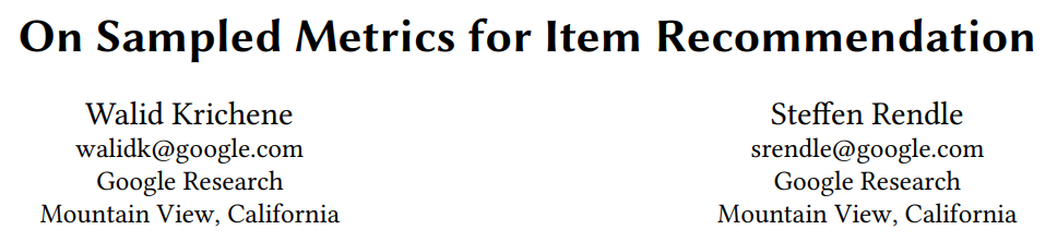Walid Krichene and Steffen Rendle. 2020. On Sampled Metrics for Item Recommendation. In Proceedings of the 26th ACM SIGKDD International Conference on Knowledge Discovery & Data Mining (KDD '20). DOI:https://doi.org/10.1145/3394486.340322