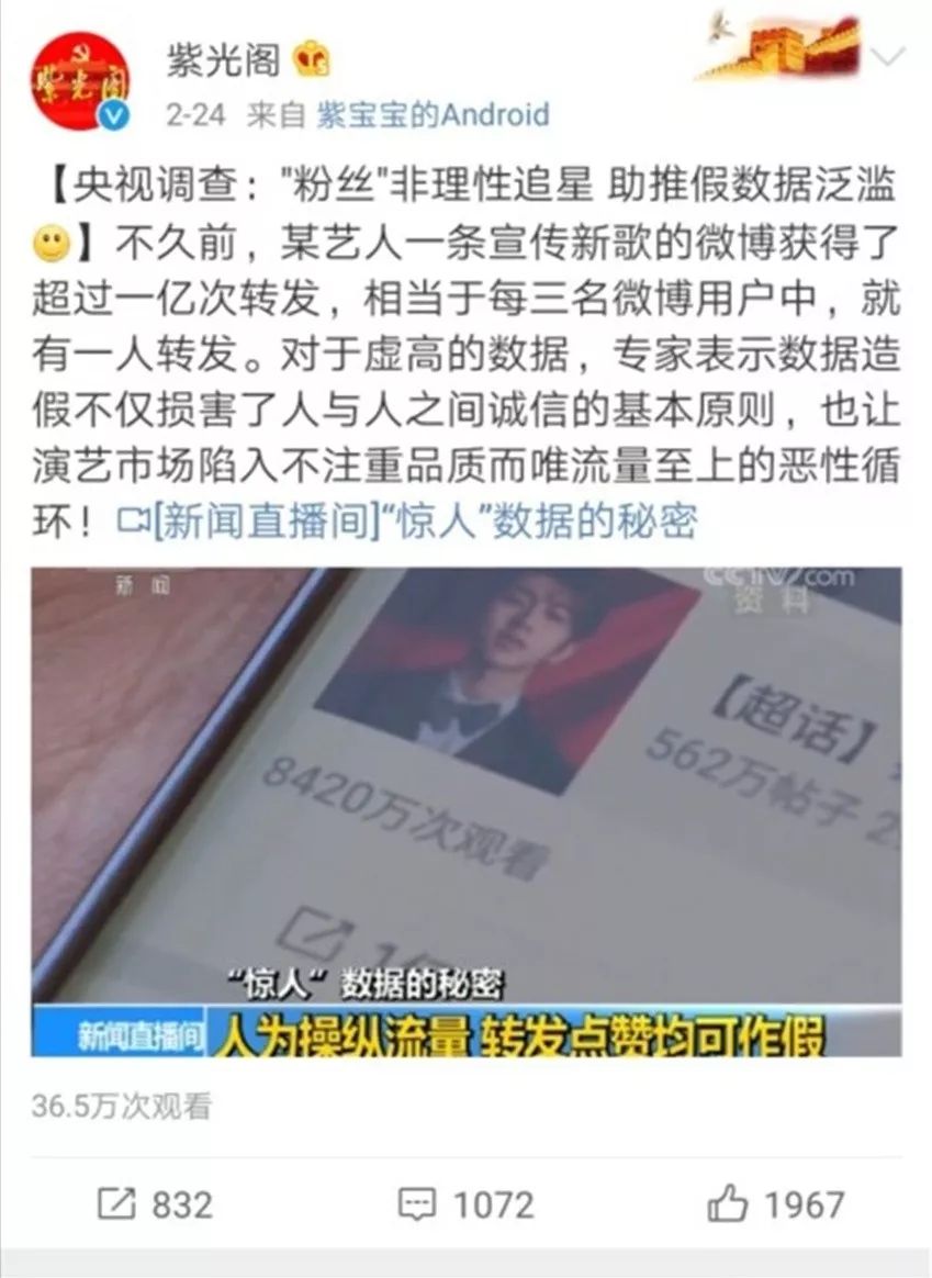 “紫光阁”1月发布的微博称,“唯数据论、唯流量观使从业者不能聚焦于作品和艺术本身,也使粉丝们陷入流量的“囚徒困境”式攀比,更使得相关领域的黑产一本万利、无所不用其极,最终置法律和他人权利于不顾。”