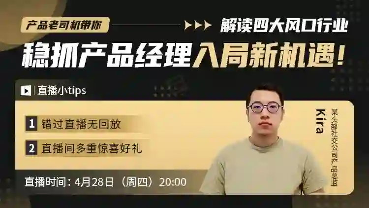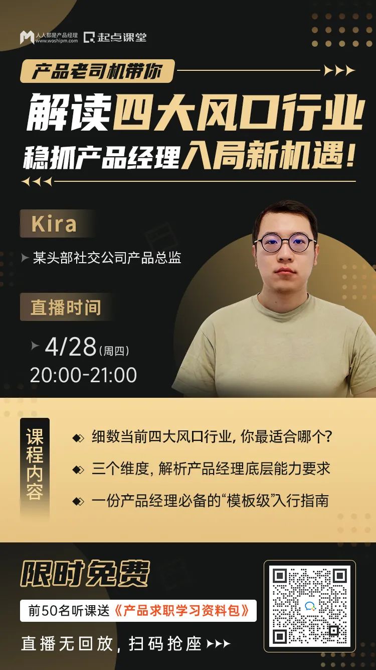别急,为了帮助正在做行业选择、求职产品经理的宝子们避开凉凉行业,【人人都是产品经理】联合【起点课堂】特邀产品老司机—某头部社交公司产品总监@Kira,周四晚上8点,做客“起点课堂产品经理入门公开课”。