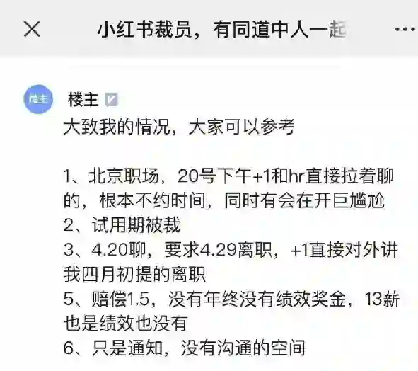熟悉的味道,熟悉的配方,小红书的员工,也是在职的最后一天突然通知被裁,然后公司采取的策略就是: