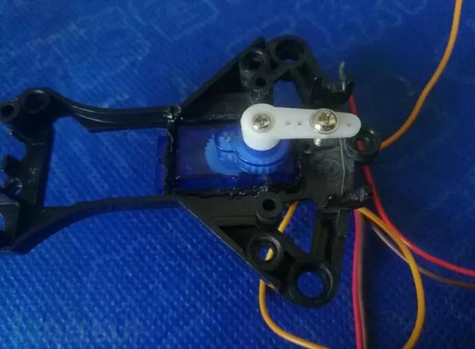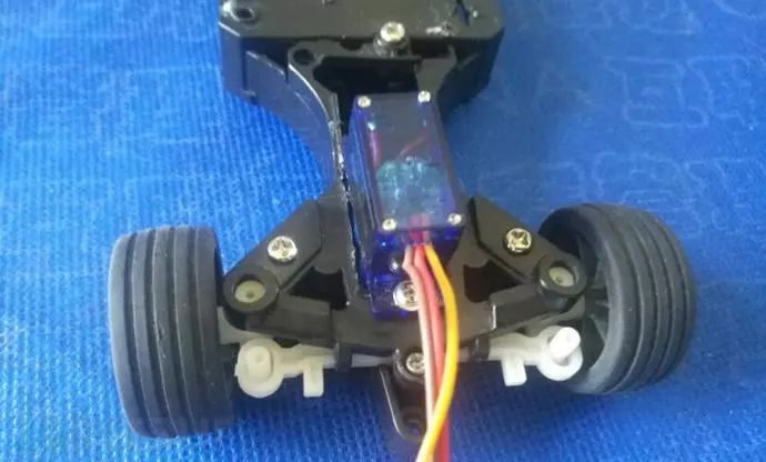 将舵机的舵把用螺丝固定,舵把在合适的位置拧上一个长螺丝钉,但是不要太长以免无法合盖。舵把的螺丝钉扣住玩具小车转向装置中间的洞。舵机牵拉,便可达到一个转弯的效果。