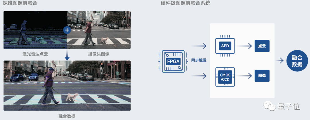 在常规激光雷达传感器的基础上,硬件层面融合进COMS传感器,通过FPGA同步触发,直接在硬件端实现不同类型数据的融合。