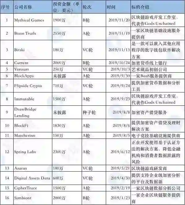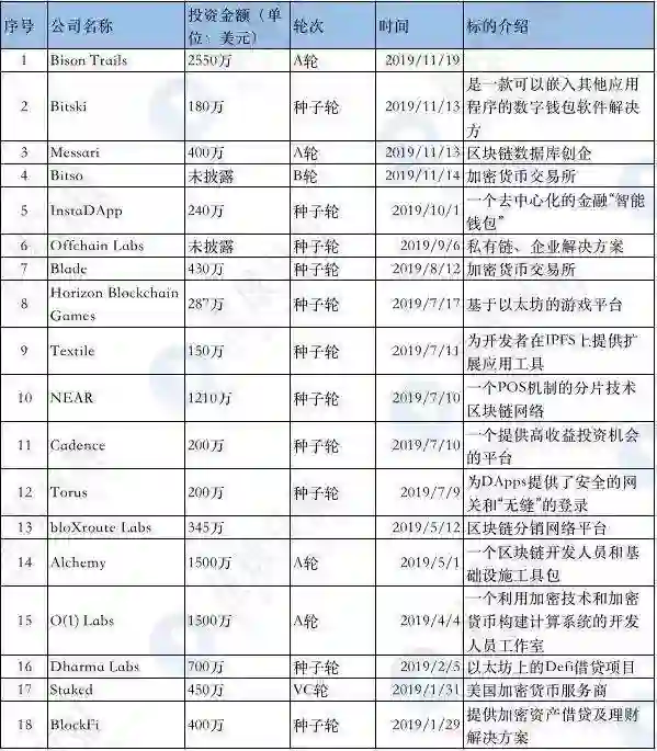 除了上述表现活跃的 10 只加密基金以外,其他加密基金总体呈现投资收缩的趋势,比如我们熟知的 Andreessen Horowitz(亦称 a16z),根据其公开披露的信息,2019 年 a16z 仅投资了包括 Compund、Arweave、Dapper Labs 和 Anchorage 在内的四家区块链和加密货币初创企业,却大大增加了在 AI人工智能和生物科学领域的投资规模。