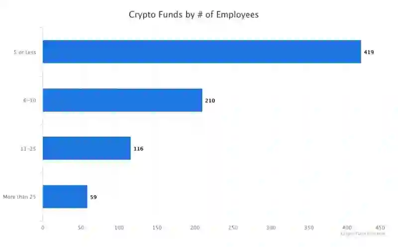 大多数 Crypto Fund 的人员规模都很小,其中许多是由他们的创始人和一两个额外人员管理的。大多数加密基金拥有四至十名员工。不到 5% 的基金拥有超过 25 名员工(这些通常是 VC基金,并不是专门投资于数字资产和区块链公司)。总的来说,全球 Crypto Fund 团队大约有 5000 人。
