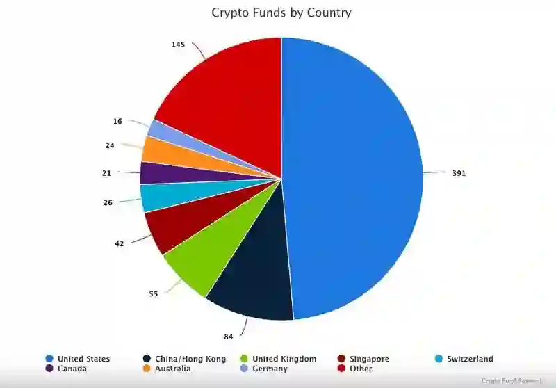 几乎一半 Crypto Fund 都位于美国。英国、中国/香港、新加坡、瑞士、加拿大、澳大利亚和德国都有大量的基金。东欧和俄罗斯也开始出现新的 Crypto Fund,开曼群岛等离岸司法管辖区也是如此。