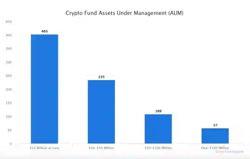 而且,绝大部分 Crypto Fund 管理的资产规模都很小,与传统 VC 比起来更是小巫见大巫。半数基金管理的资产不足 1000 万美元。然而,其中也不乏一些资产规模超过 1 亿美元的 Crypto Fund,其中包括 Pantera Capital、Galaxy Digital assets、Alhpabit Fund 和 Polychain Capital 等。