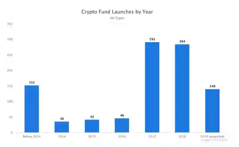 2017 年,伴随 ERC-20 代币的爆发,Crypto Fund 也迎来募集高峰,一共有 291 支 Crypto Fund 推向市场,包括对冲基金和风险投资基金在内的新基金超过 290 支,这是 2016 年推出基金数量的三倍多。