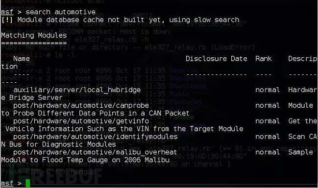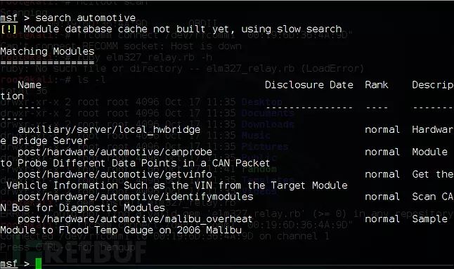 msf >exploit现在,我们已在车辆中创建了Metasploit和CAN协议之间的硬件桥接。这样我们就可以开始使用Metasploit中的汽车模块了。