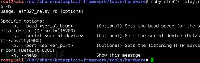 kali >ruby  elm327_relay.rb -s /dev/ttyS0现在,我们已经将Kali Linux配置为与ELM 327设备通信,我们需要创建一个到Metasploit的硬件桥接。Metasploit被构建用于TCP/IP的通信,而我们现在需要它通过串口与汽车原生的CAN协议进行通信