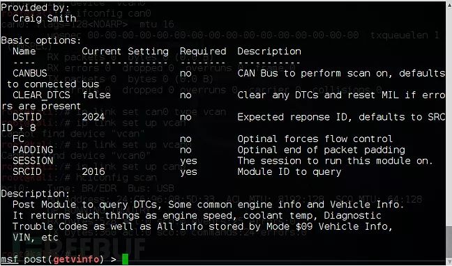 msf > use post/hardware/automotive/getvinfo该模块将查询并收集所有车辆DTC(诊断故障码)和其他信息,如速度,冷却液温度,VIN甚至清除DTC。