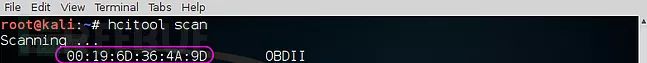 kali > hcitool scan根据扫描结果,这里我的MAC地址为00:19:6D:36:4A:9D。