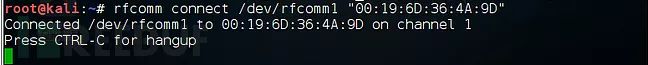 kali > rfcomm connect /dev/rfcomm1 "00:19:6D:36:4A:9D"下一步是运行ELM 327继电器,使Metasploit能够与ELM 327芯片组通信。你可以在/usr/share/metasploit-framework/tools/hardware目录下找到它。