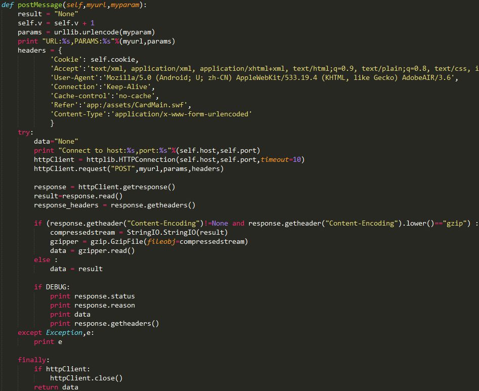使用Python的urllib库来进行HTTP协议发送,另外,由于server端可能返回gzip格式的数据内容,所以需要利用Python的gzip库对gzip格式的返回数据进行解码。