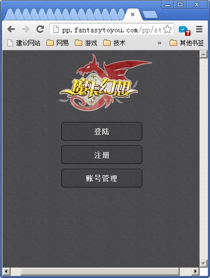 但是,这个key是怎么生成的呢?猜测是在登陆页面生成的,同样利用反编译,找到其登陆界面的网址:http://pp.fantasytoyou.com/pp/start.do?udid=3D:BF:4A:6A:C0:7D&locale=CHS&gameName=CARD-ANDROID-CHS&client=flash,这样就可以在Chrome中打开了: