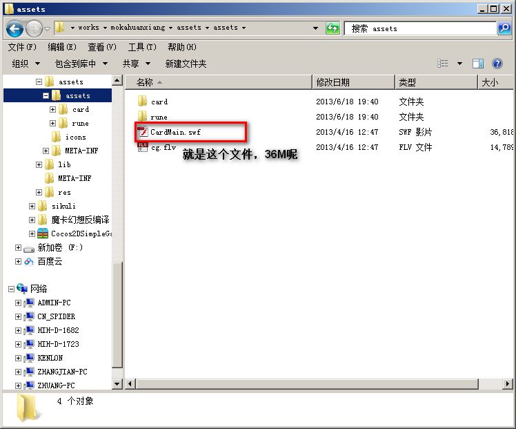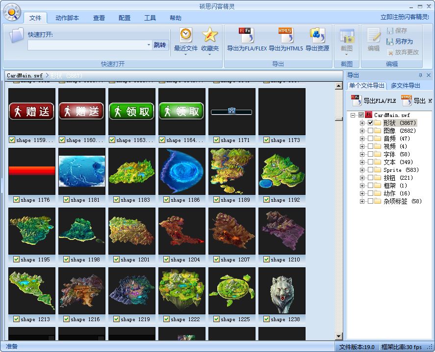 得到了Cardmain.swf文件,在浏览器下直接打开看看,没有任何反应,只是白屏,怎么办呢?再来反编译,使用业界出名的硕思闪客精灵进行反编译试试,安装了一个企业版,打开这个swf文件,经过“漫长”的等待,终于,结果出来了。可以看到,游戏界面主要的形状、图像、音频、视频以及关键的动作脚本都是在这个swf文件里面的。
