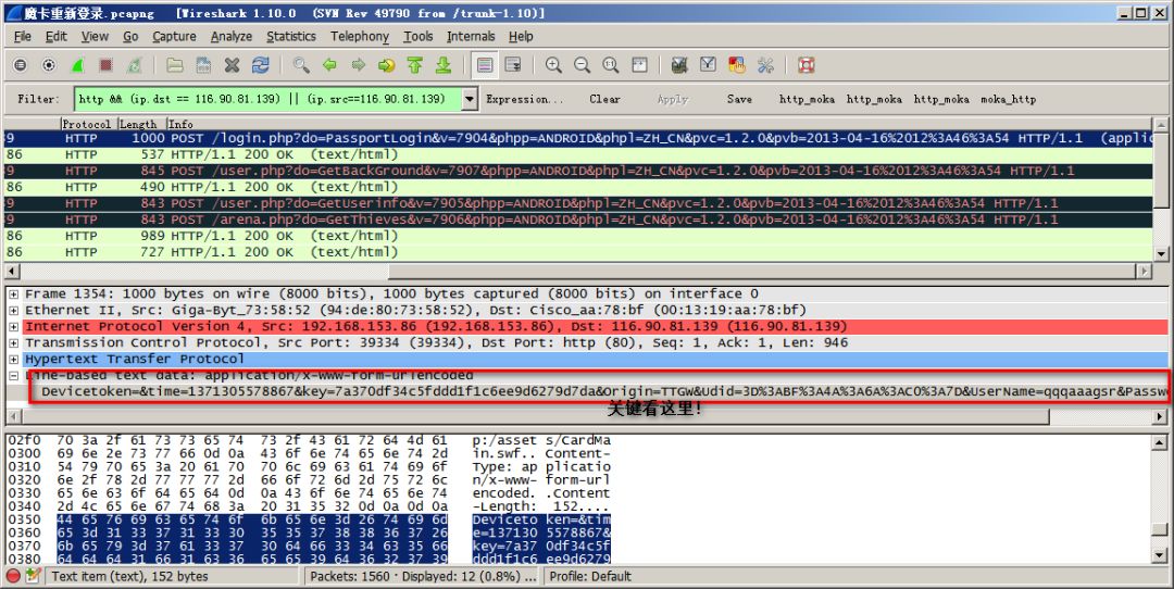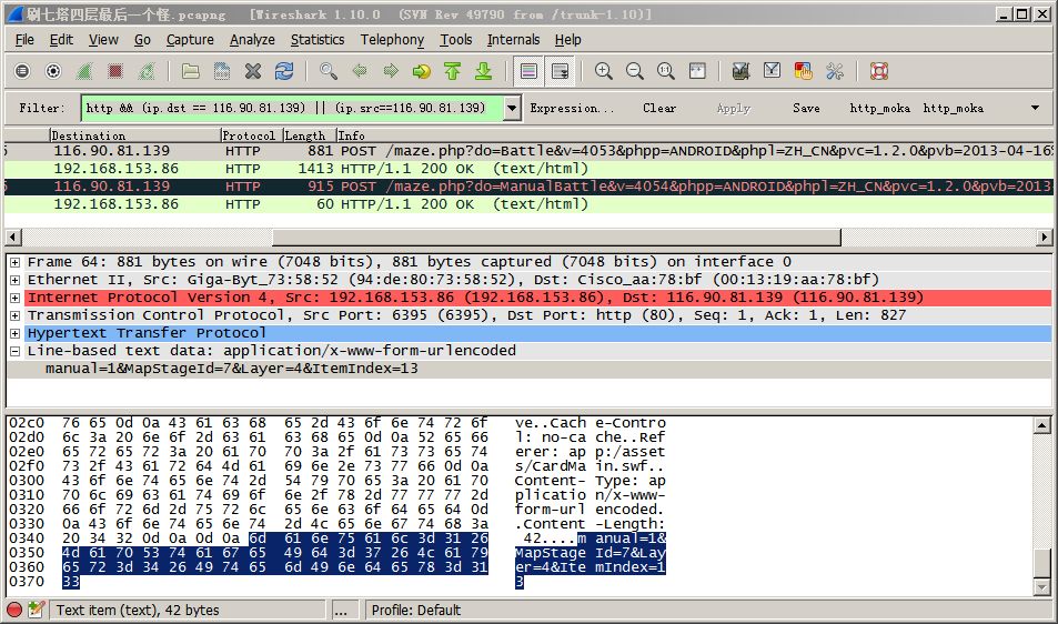 这句话的意思是,过滤掉HTTP协议的中目标地址为116.90.81.139或者源地址为116.90.81.139的协议包,其中116.90.81.139为魔卡幻想的web server。可以看到,其实每次打一个怪,相当于给服务器发送了一个POST命令!而POST的数据内容为“manual=1&MapStageId=7&Layer=4&ItemIndex=13”——这句话什么意思呢?Manual=1,代表自动战斗,MapStageID=7,代表我打的是第7个塔,也就是末日之塔,ItemIndex=13是什么意思呢?为什么是13呢?暂时搞不清楚。