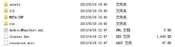 我们知道android的安装文件.apk实际上是一个压缩包,所以将你下载下来的魔卡幻想的apk文件后缀改为zip并解压(我放置在D:\works\mokahuanxiang\下面),得到如下文件: