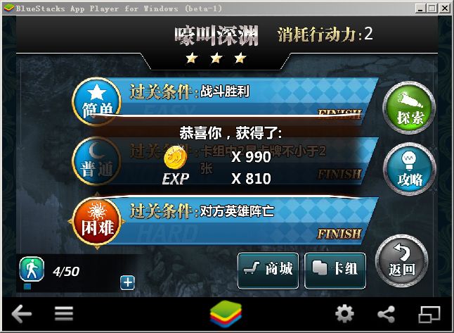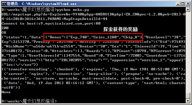 再举一个简单的例子,就是对某个地图进行探索,返回信息。下图为我进行一次探索的运行截图,我对编号为44的关卡进行探索,获得了740点经验,1280个金币,以及一个8号魔幻碎片。