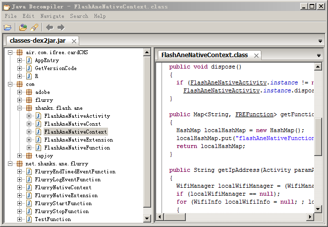 可以看到,dex2jar的文件夹下面有一个shanks.flash.ane的类,ane即Adobe AIR Native Extension,因为Adobe AIR是跨平台的,Mac、Windows、Android、iOS都能运行,但也有其局限性,比如在Android上面,AIR就无法调用Android系统级别的API,比如摄像头、系统通知等。