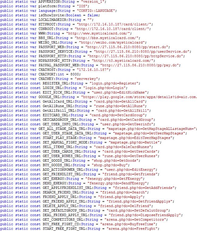所以,大胆猜测,大部分游戏逻辑是写在Adobe AIR层的。据百度百科,AIR是针对网络与桌面应用的结合所开发出来的技术,可以不必经由浏览器而对网络上的云端程式做控制,这样的优势,就是跨平台,主要的逻辑代码无论在Android上还是在IOS上,甚至在Windows Phone上都是一致的。在每个平台上,只要实现对应的系统API即可,这也是为什么,魔卡的账号体系在iOS上和Android上是统一的,不像某掌门游戏。