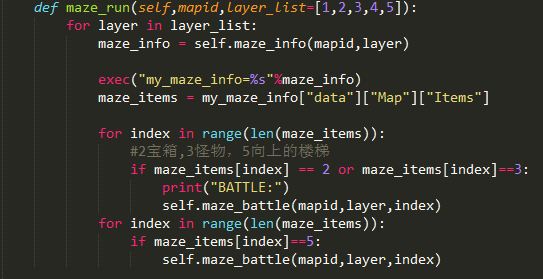 其中maze_info返回的是一个指定地图和楼层的json格式的信息,我使用exec将其转化为一个dict对象,然后获得其中的Items字段,如果这个字段是2或者3的话,我就去打,最后再打去楼上的楼梯口,很简单吧。