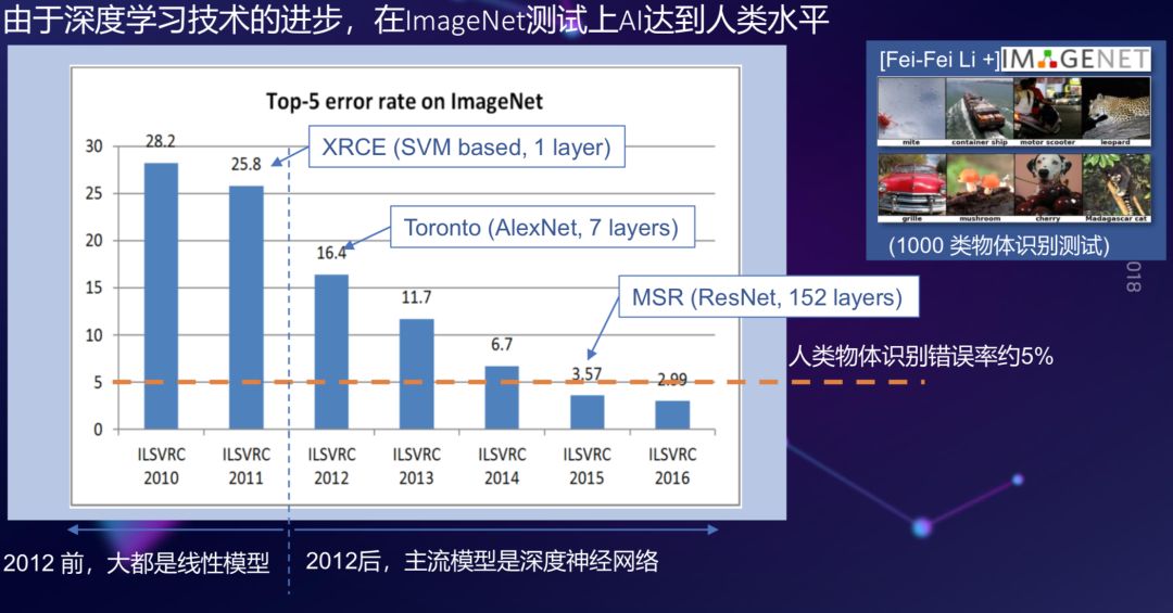 2012 年,Hinton 教授和他的学生提出用一个 7 层的深度卷积神经网络做这个任务,一下子把错误率从 25% 降到 16%,当时数据刚刚出来的时候,很多研究员都认为这个数据是不真实的,训练集和测试集在中间过程很可能被污染了,但经过仔细检查,发现这个数据就是真实的结果,而且,此后这个错误率每年又降了 30% 左右,持续到 2015 年,在这个数据集上的错误率降到了 3.57%,这是什么概念?让一个学生去做这个测试,一般人眼不会百分之百对,人往往会很多错误,人的错误率在 5% 左右,你可以认为,在 2015 年,基于深度学习的图像识别已经超过了人的水平。