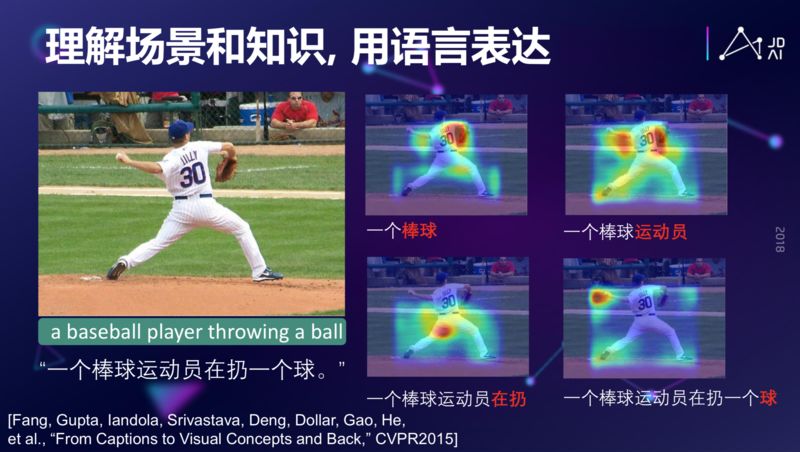如果我们用深度学习来看上图,会生成这么一句话:一个棒球运动员在扔一个球。为什么会生成这么一句话?比如,我们发现模型“看”成这个图片的时候,它实际上先是注意力集中在棒球手套这个地方,这是一个特征表明这是一个棒球运动。随后当计算机注意到跟广的区域的时候,它会提出这是个运动员。再往下,当 AI 模型注意到一个大腿扭曲的姿态的时候,它会认为这是一个人的动作,凭这些,计算机会认为这是一个人扔球的动作,虽然这个球的占的整面积非常小,但是因为语言模型在语义上的驱动,使得这个球也能够被识别出来,最后形成一句完整的有意义的话。这就是跨越视觉和语言两个模态,从图片到文本描述生成的过程。
