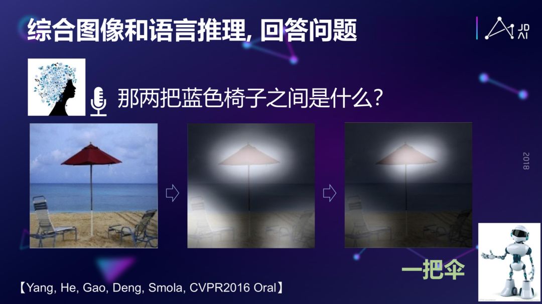 如果你问 AI 系统,上图中两把蓝色的椅子之间是什么东西?最后它会告诉你,这是一把伞。模型的实现过程是:第一步,有一个 question model,先在语言上理解这个问题是什么,同时需要有一个 Image Model,对这个图片本身做一些理解,同时还有更重要的 multi-level attention model,就是负责在图片的信息和文字信息之间做多层 attention 的推理,最后得到这个答案,这称为视觉 - 语言多模态推理问答。