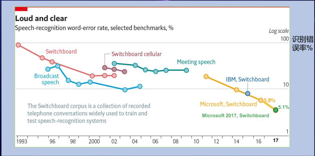 2010 年底,深度学习在大规模语音识别核心问题上得到了突破,此后,语音识别错误率迅速往下降,一直最近在 switchboard 测试集上降到了 5% 左右。