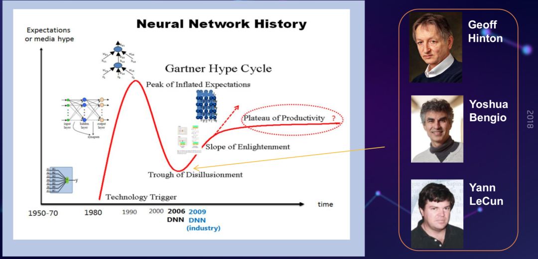 深度学习可简单认为是深层的神经网络模型。回到多年前,大概在七八十年代,那时是单层的感知机和浅层的神经网络。理论上多层神经网络拥有非常强的分类能力,能拟合任意分类边界。80 年代,学术界技术界对神经网络期望是非常高的,但是很快在 90 年代的时候,大家发现神经网络由于各种原因,如数据不足,训练很困难,在很多任务上做的不如简单的模型好,大家对它的期望就降下来了。但即便在这个低谷时期,还是有科学家坚持把这个领域往前推动。