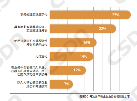 在CSDN 《2019-2020 中国开发者调查报告》中,64%的企业尚未实现智能化,其中14%的企业无信息化。对于用机器学习来做预测,大部分互联网公司是有一些工作。再往深的看,真的在使用AI系统,包括自动化的工具来提升整体效率。最后类似字节跳动、百度这样的公司都是算法驱动的。当然这份报告中并不是对所有企业有代表性,还是有IT能力的企业。
