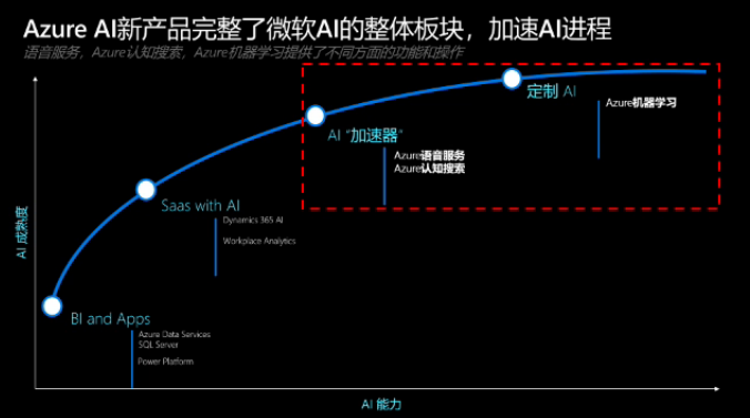 我们从早期的BI和Apps,再到PowerPlatform。在这个过程中,最基本的先构建数据驱动应用,在左下角这一块。SaaS加上AI能力,Dynamics 365,Dynamics 365相当于CRM和ERP结合的产品。Dynamics 365里面内置AI的能力,把这些API集成到这里面,无论是供应链的分析还是订货预测,都直接提供这些能力打包,如果没有其他定制化的话,用户可直接拿来用。