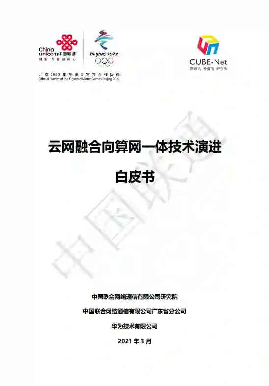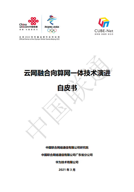 2021 年 3 月,中国联通发布了《中国联通 CUBE-Net 3.0 网络创新体系白皮 书》。CUBE-Net 3.0 是以打造算网一体为重要目标,融合云原生、边缘计算、人 工智能、内生安全等新的技术元素,强化要素深度融合,构建支撑经济社会数字 化转型的新一代数字基础设施。