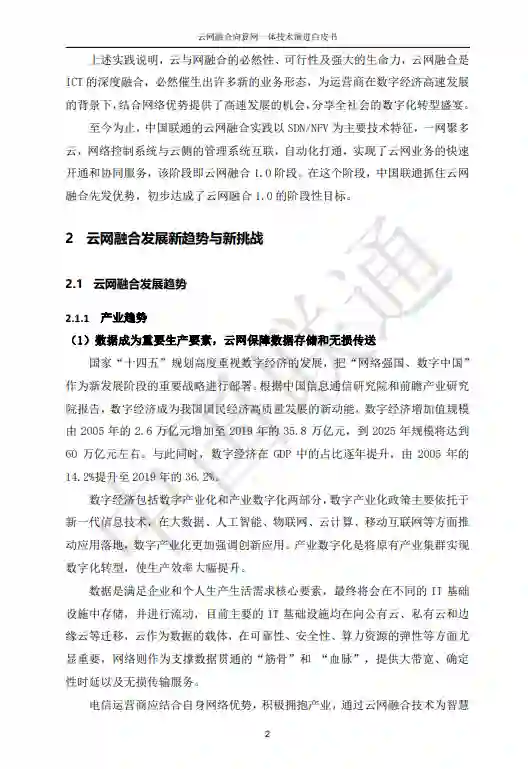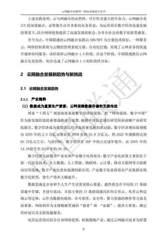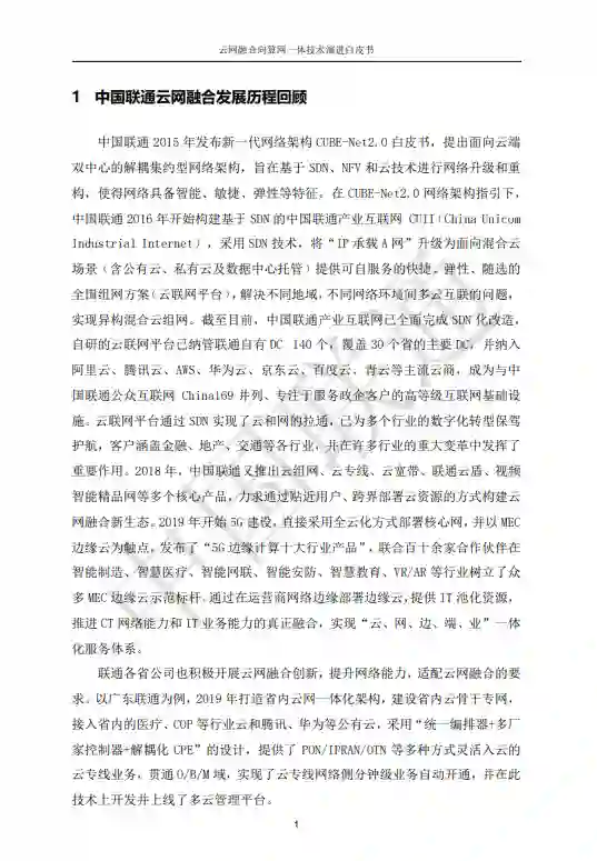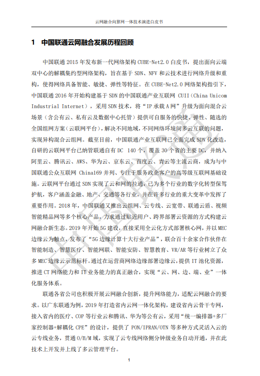 本白皮书在 CUBE-Net 3.0 架构的指引下,结合云网融合发展趋势,介绍了 中国联通云网融合向算网一体演进的网络架构、技术路线、关键能力与应用实践。从 2015 年开始,中国联通先后结合 SDN、SR 等技术,构建起包含广域 IP 网与智 能城域网的新一代承载网基础设施,实现用户便捷入云,云间互联及弹性连接服 务。2019 年 11 月,中国联通发布了业界首部《算力网络白皮书》,阐述了未来算 力业务形态、平台经营方式、网络使能技术等方面的观点,对算力网络的技术研 究和产业推动产生了重要影响。2020 年 10 月,中国联通发布《算力网络架构与 技术体系白皮书》,结合新基建等最新政策导向与 IPv6+时代可能的商业模式创 新,阐述了中国联通算力网络架构设计、功能模型、层间接口与各功能层的关键 技术,并结合若干场景对算力网络的应用和部署方式进行了展望。从云网融合到 算网一体,网络的角色和价值都进入新的阶段。网络基础设施和算力基础设施, 构成数字经济的基石,网络需要为云、边、端算力高效协同,提供更智能的服务。