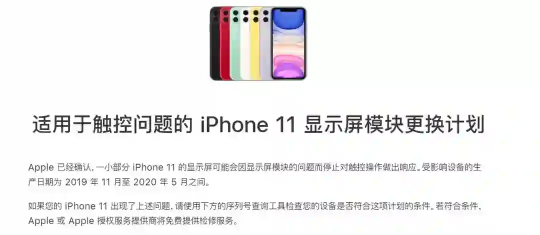 官方表示,“Apple 已经确认,一小部分 iPhone 11 的显示屏可能会因显示屏模块的问题而停止对触控操作做出响应。受影响设备的生产日期为 2019 年 11 月至 2020 年 5 月之间。如果您的 iPhone 11 出现了上述问题,请使用下方的序列号查询工具检查您的设备是否符合这项计划的条件。若符合条件,Apple 或 Apple 授权服务提供商将免费提供检修服务。“