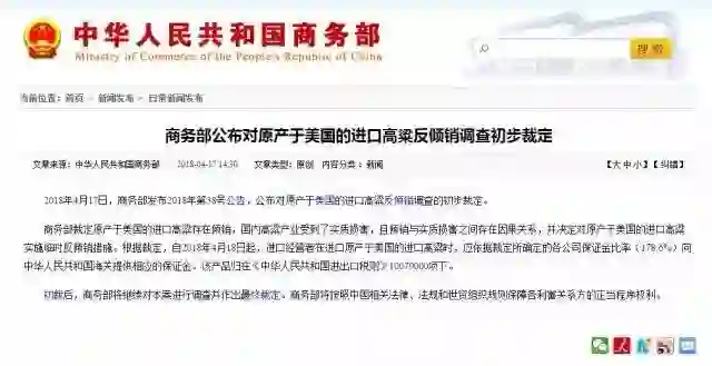 2018年4月17日,商务部发布2018年第38号公告,公布对原产于美国的进口高粱反倾销调查的初步裁定。