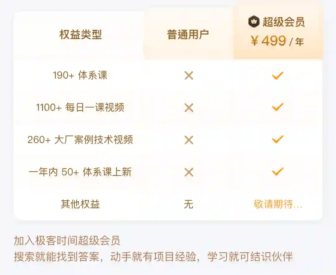 会员可以随时免费查看全站近 200 个体系课,本专栏也在其中。最关键的是,会员权益还包括了未来一年内更新的专栏,相当于一年内的新课都不用再花钱单独买,绝对超值,推荐入手。