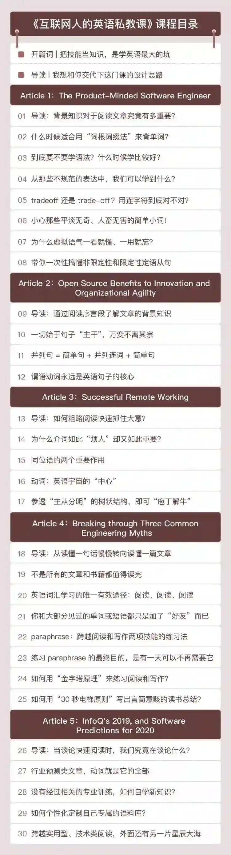 这门课的内容组织也十分用心,每篇语料文章都有其侧重点,涵盖了英语的词汇、语法、阅读写作、学习方法等方方面面。选题上也同样是精挑细选:打破与工程师相关的三个迷信、2020 年的软件预测、开源软件对创新的好处、远程工作的最佳实践、具有产品思维的软件工程师。