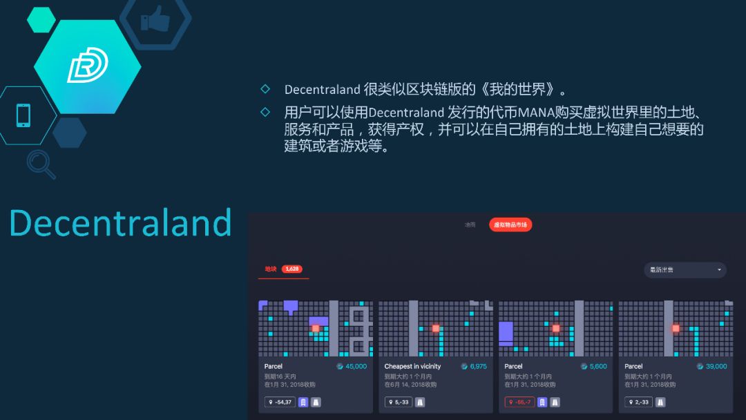除了这个游戏,还有Decentraland,它跟《我的世界》很像,通过游戏里面的一个token,可以去购买虚拟世界里面的土地。